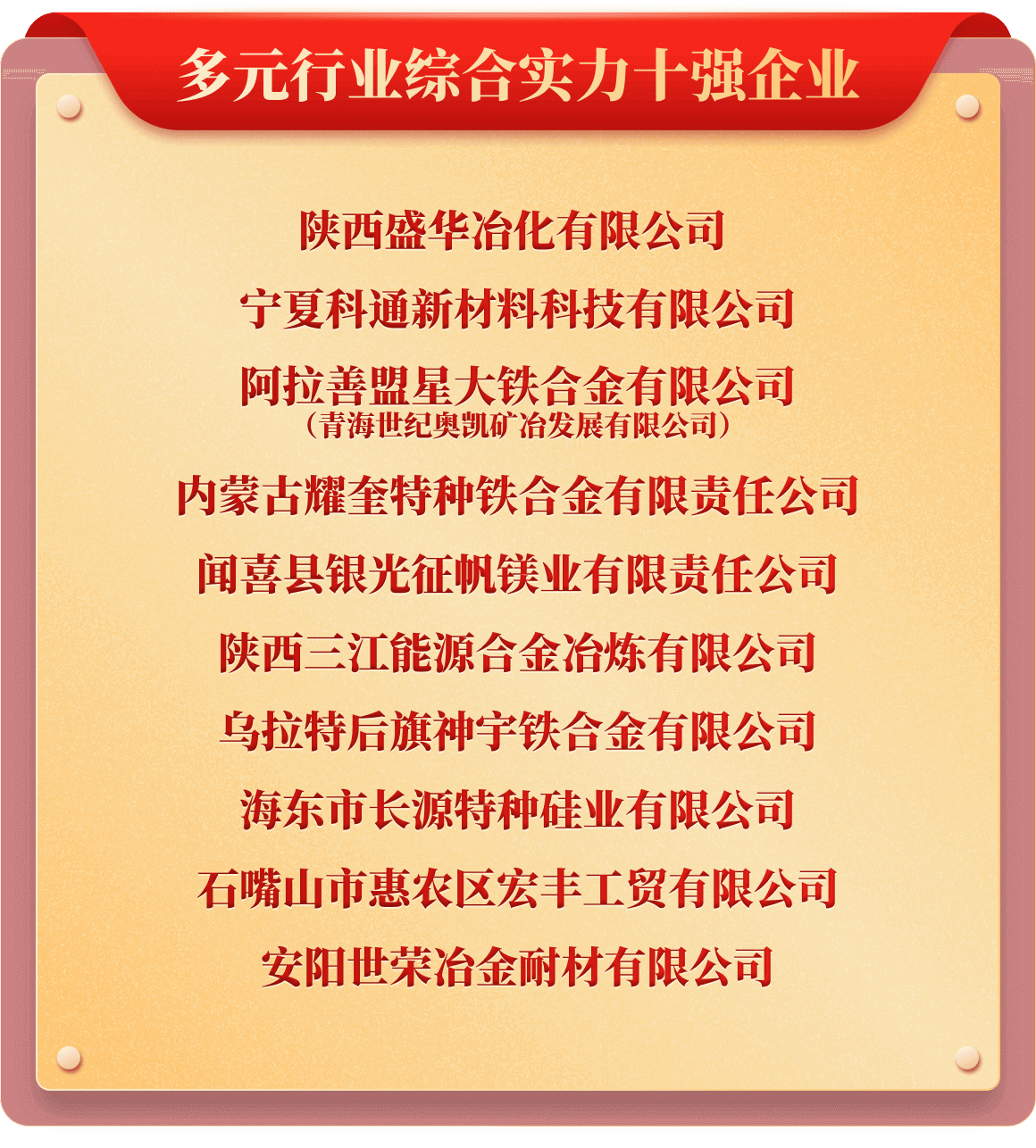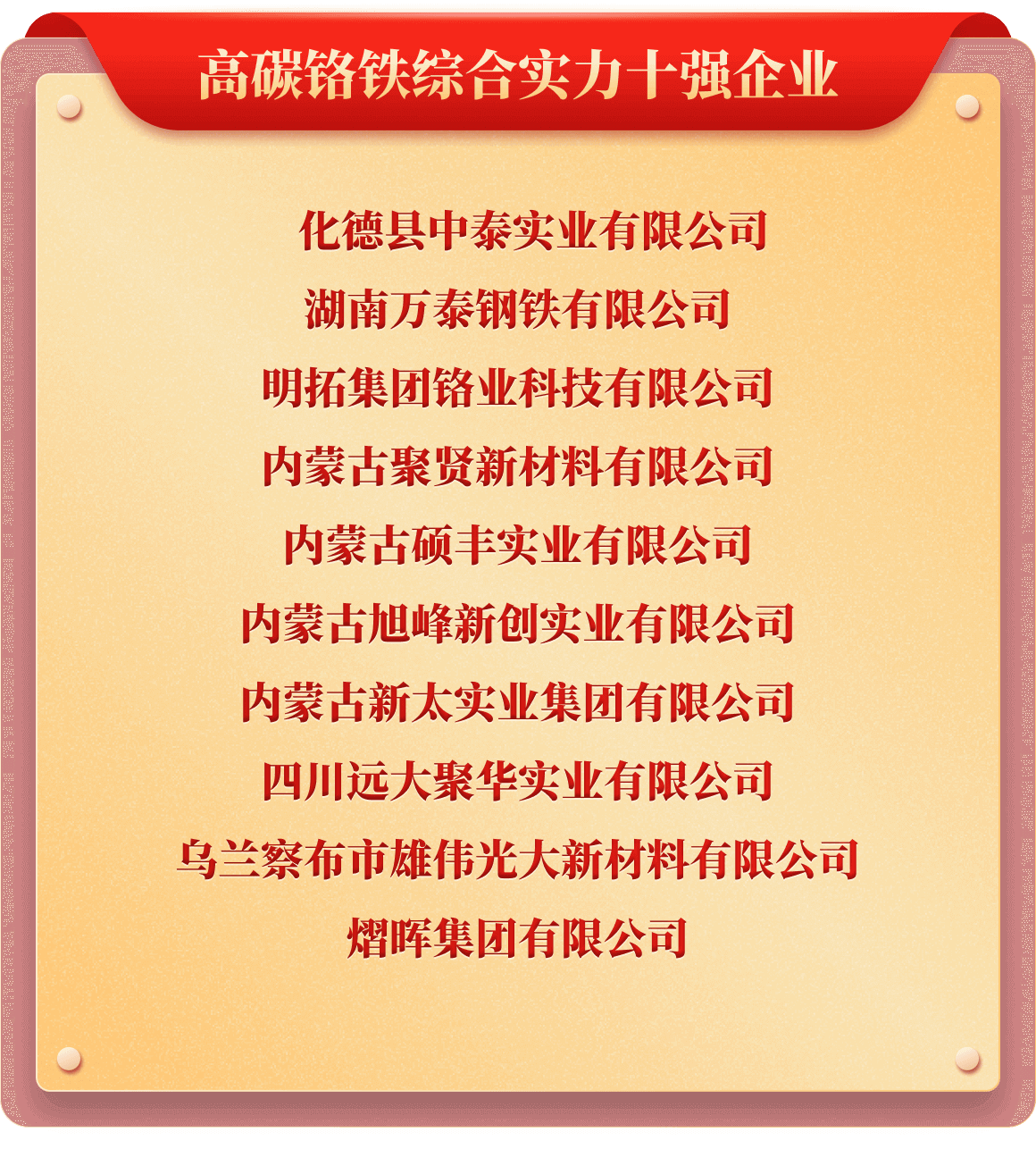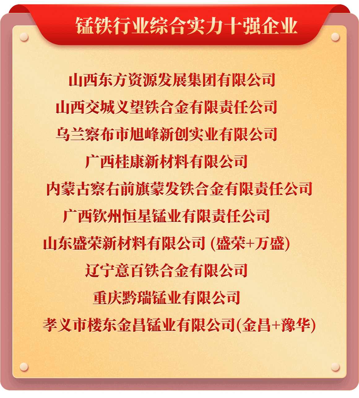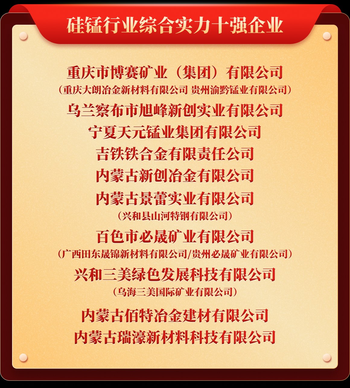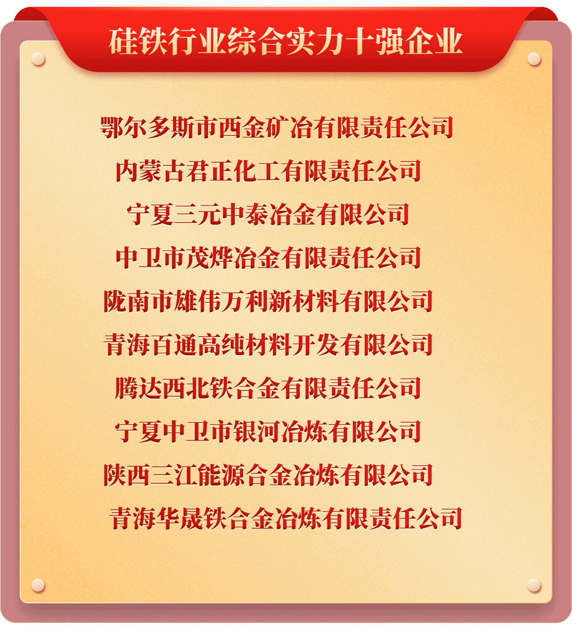 岁末年初,为树立行业榜样,推动行业持续健康发展,也为提升企业行业价值及市场影响力,铁合金在线发起了“2025年中国铁合金行业十强企业”评选活动。从企业实力、企业口碑、企业品牌、产品质量、发展规划、成本控制、经营环境等多维度考评,覆盖铁合金多类产品、海量企业,评选出“铬铁、铬矿、硅锰、锰矿、锰铁、电解锰、金属硅、硅铁、镍铁、镍矿、钒、钼铁、钼精矿、钨、钛、多元、稀土、稀土合金、金属镁”等20类综合实力十强企业。