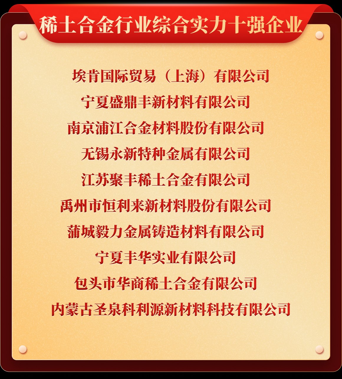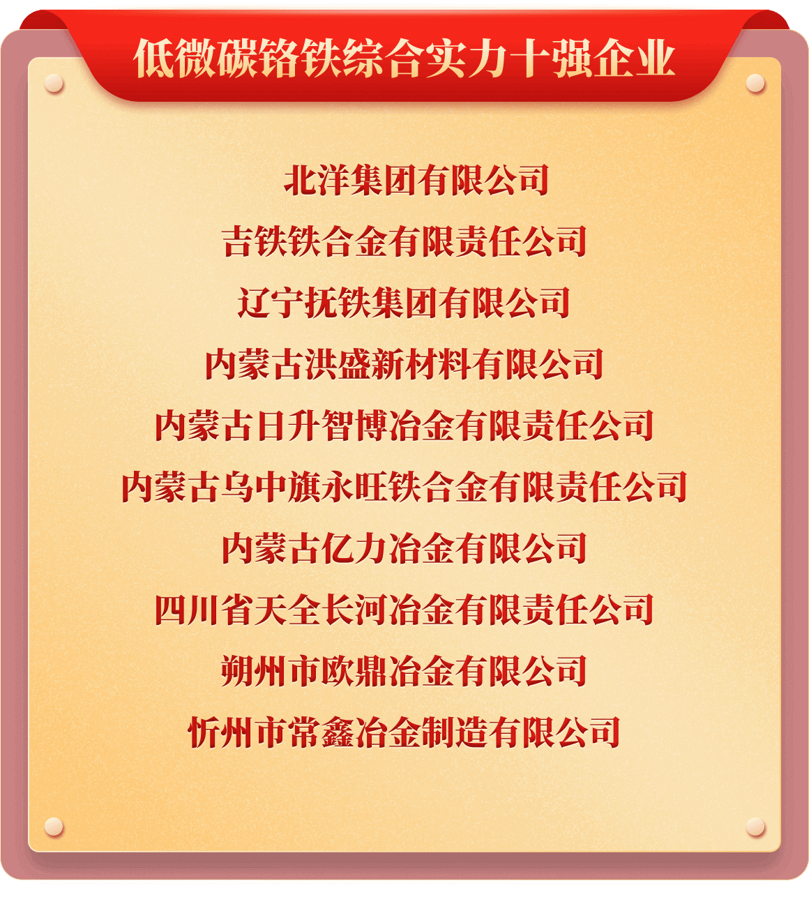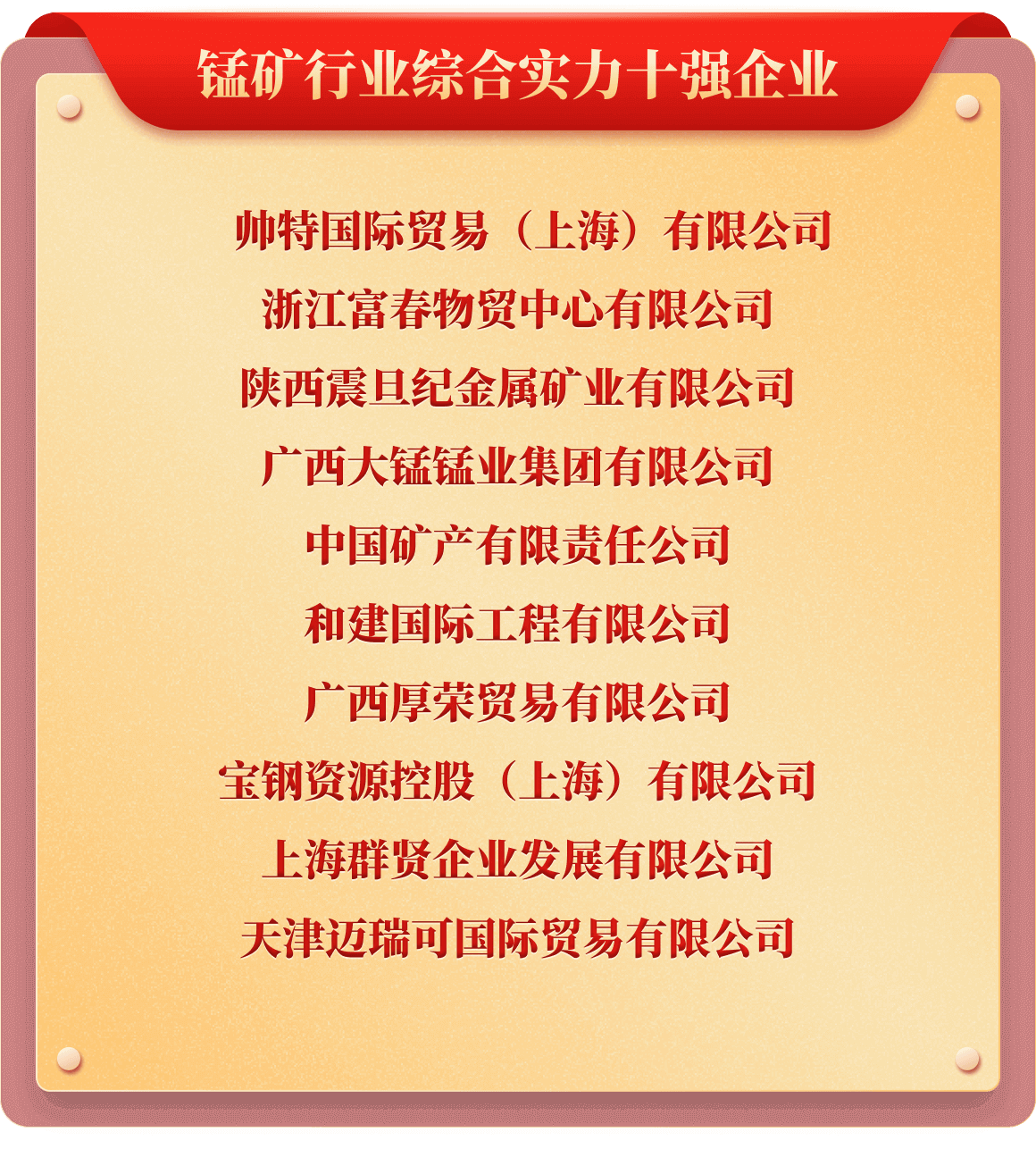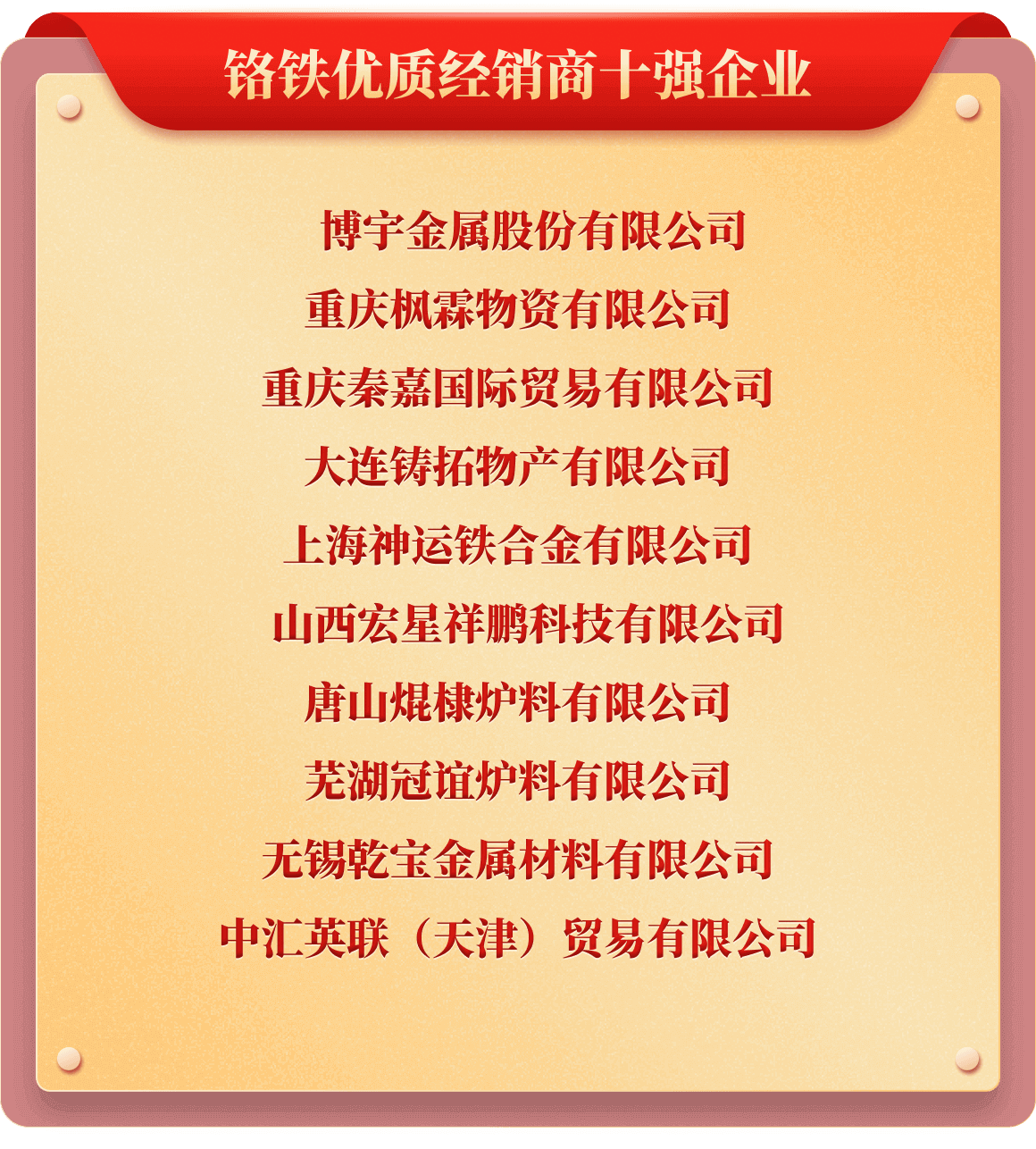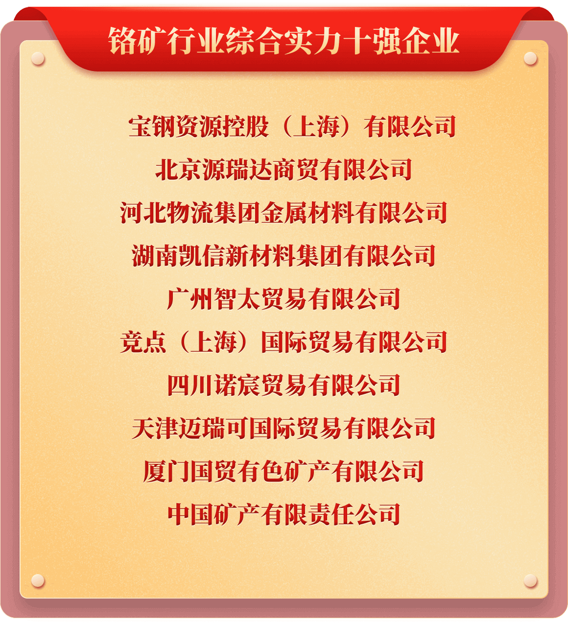 岁末年初,为树立行业榜样,推动行业持续健康发展,也为提升企业行业价值及市场影响力,铁合金在线发起了“2025年中国铁合金行业十强企业”评选活动。从企业实力、企业口碑、企业品牌、产品质量、发展规划、成本控制、经营环境等多维度考评,覆盖铁合金多类产品、海量企业,评选出“铬铁、铬矿、硅锰、锰矿、锰铁、电解锰、金属硅、硅铁、镍铁、镍矿、钒、钼铁、钼精矿、钨、钛、多元、稀土、稀土合金、金属镁”等20类综合实力十强企业。